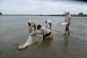 Once every month the same four sites in Mangawhai Harbour were visited around low tide. At each site three drags of the net were done and the contents collected, identified, counted and measured. The catch was then returned to the water to continue growing.
